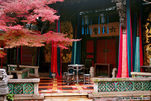 雍福会的装饰很不低调:红木雕窗、水晶吊灯、在池塘中悠游的锦鲤、佛像、中国灯笼、古董和设计师家具。