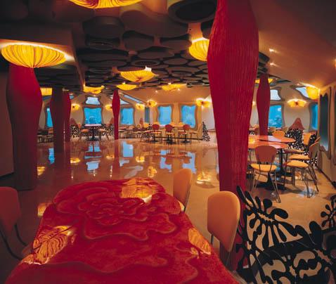 以海洋生物作布置设计,有水母型餐椅、海星顶灯、珊瑚灯饰及各种海草型铁花围柵等。