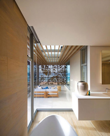 与一楼不同,二楼是一个较为私密的空间,总共有四间卧室,每间都带有各自的露台,面朝大海的方向。值得一说的是,二楼的露台是挑空出去的设计,不仅视野更好,还可以为一楼充当屋檐及雨棚。二楼地面采用的是木地板,材质更接近天然。虽然每一块功能区并没有明显的界限,但是不同的家具材料以及细节装饰又强调了它们各自的存在感。为了配合主人的品位,设计师在墙面以及屋子的角落里都作了一些艺术品装饰,在软装上也更多地吸取了主人自己的意见。其中卫浴空间据说是主人最满意的部分,开放式的蛋壳浴缸就被安放在窗前,主人在泡澡时可以透过金属窗罩眺望到海景,而外面的视线则无从窥入。主设计师Patrick Ferguson告诉我们:“朴素的室内空间会让人把注意力集中在室外,那是一幅美丽的海景画,它才是重点。”