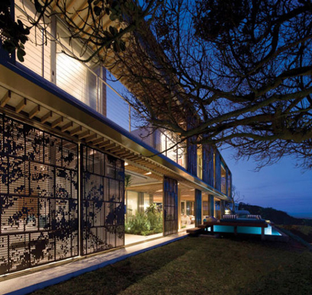 这栋位于南非德班北部海岸La Lucia的豪宅,正面规规矩矩,但背面全部以镂空金属网罩覆盖,将金属感的硬朗与蕾丝布料的柔美特质完美结合,在夜晚灯光的映衬下更显魅惑,犹如为住宅罩上了一层蕾丝面纱。