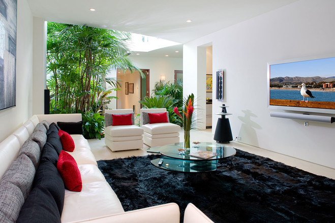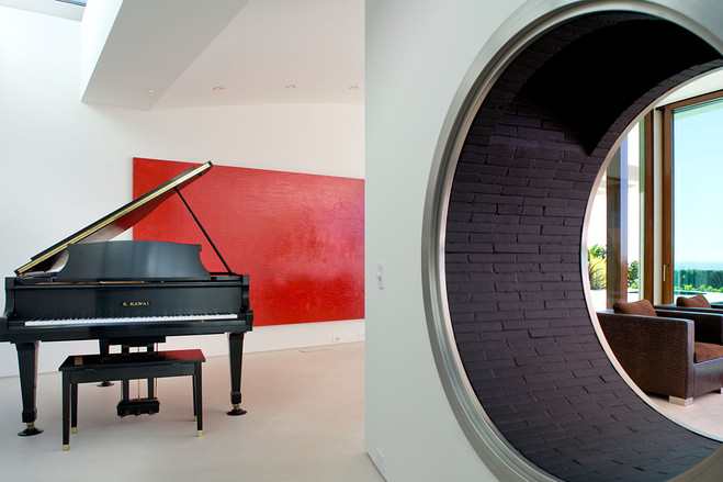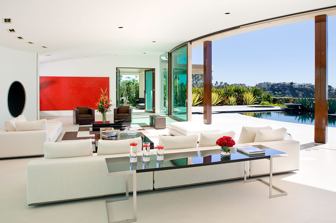 建筑设计师克里斯琴•莱特(Architect Christian)设计了该豪宅,将室内和室外融为一体。斯特里克说图中所示的这个长达65英尺(约20米)的房间是对建筑师最大的挑战,为此建筑师特别设计了一堵弧形玻璃墙。大房间外是一个海水游泳池。