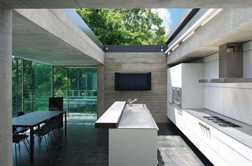 这座由Eldridge Smerin设计的住宅一面是落地玻璃窗,另一面是由打磨过的黑色花岗岩、钢板和磨砂玻璃构成的幕墙。既可以欣赏到全方位的景色,也最大限度地保护了隐私。