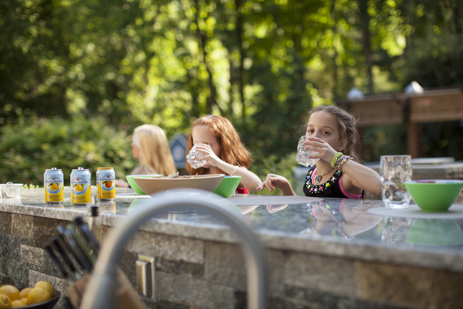 托德·雷斯勒(Todd Ressler)和凯西·雷斯勒(Cathy Ressler)夫妇这座位于康涅狄格州纽黑文(New Haven)市郊的住宅中有一个精致的室外厨房,带定制橱柜,一个全功能吧台,一个比萨烤炉和一个啤酒龙头。图为雷斯勒夫妇和孩子埃玛(Emma,坐着的)及阿比盖尔(Abigail)在室外起居空间内。