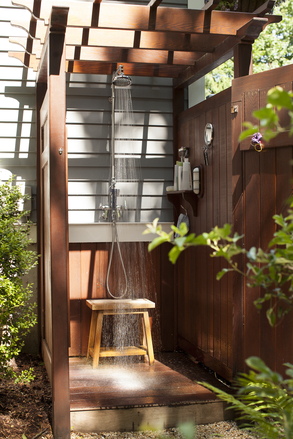 图为加州帕洛阿尔托(Palo Alto)一座住宅的室外起居空间,配有一个室外浴缸,由加州奥克兰(Oakland)的建筑师凯西·施瓦贝(Cathy Schwabe)设计。