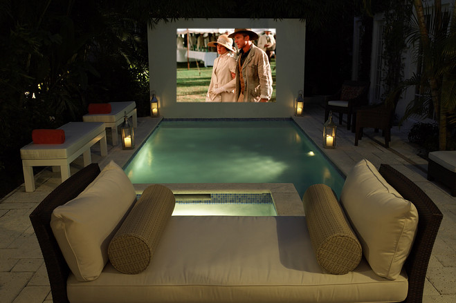 室内设计师坎皮恩·普拉特(Campion Platt)的房子位于佛罗里达州棕榈滩(Palm Beach),建于1926年,这座平房的屋后露台有一块室外电影屏幕。室内放映机将电影投射到沿游泳池后方搭建的屏幕/墙壁上,他说,他常在夜间或开派对时用这个屏幕看电影。