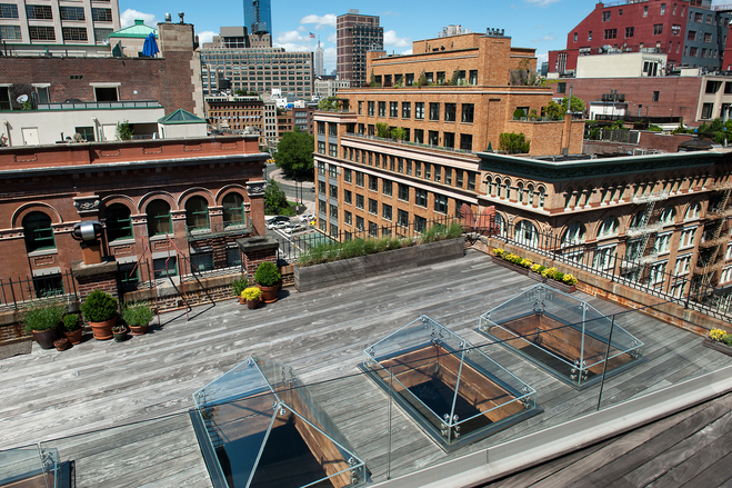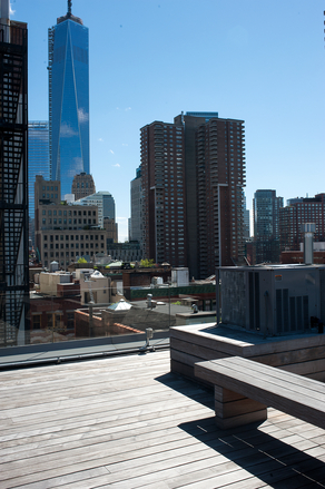 从阿莫罗斯的屋顶室外起居空间(也配有一个室外淋浴房)可以看到世界贸易中心一号大楼(One World Trade Center)。