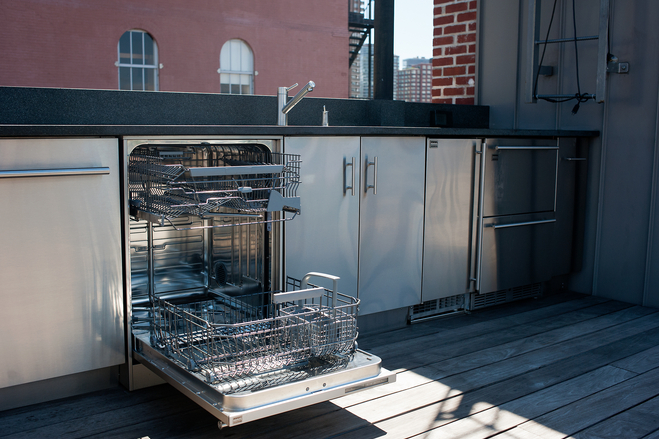 多媒体艺术家格里马内萨·阿莫罗斯(Grimanesa Amoros)住在纽约翠贝卡(TriBeCa)地区,她家有一个很大的屋顶露台,露台上有几块休息区,配有热水浴缸、室外淋浴房和一个有大烤架、洗碗机和制冰机的全功能厨房。