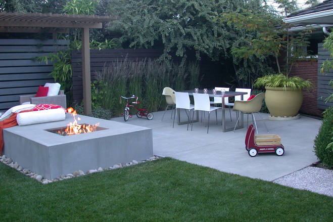 埃克利的客户詹娜·西尔韦斯特(Jenna Sylvester)和乔纳斯·西尔韦斯特(Jonas Sylvester)想把20世纪中期的现代风格延伸到自家后院。他们在后院安装了一个火坑,它可以兼做躺椅、电视柜和餐桌。