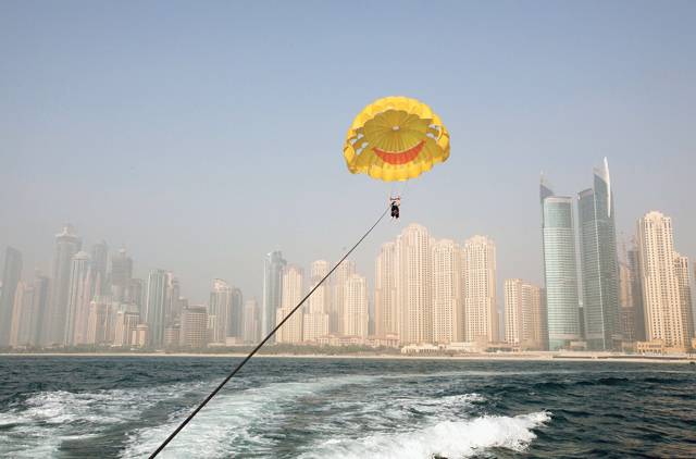 在朱美拉海滩,游客可以乘滑翔伞从200米的高空俯瞰地平线与迪拜全景。如果为期10分钟的观赏时间太短,也可以乘直升机遨游整个迪拜酋长国。
