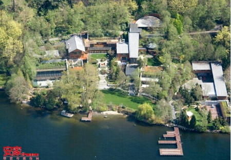 这幢豪宅前方俯瞰烟波浩淼的华盛顿湖,背后深入湖畔东岸的一座山丘,属于“掩土建筑”,犹如一座堡垒要塞。建筑物地上4层,地下深不可测,外观呈现“西北太平洋岸别墅”风格,看似一座十八、十九世纪的庄园,林木蓊郁、气象万千。进入的所有宾客需先通过严格的安检,才会获准进入这幢被当地人称为“大屋”的豪宅。这座府邸所有领地分为12个区,包括办公室设备、一个体育馆、7个卧室、6个厨房、24个浴室、1个穹顶图书馆、1个接待大厅和1个养殖三文鱼及鳟鱼的人工湖。