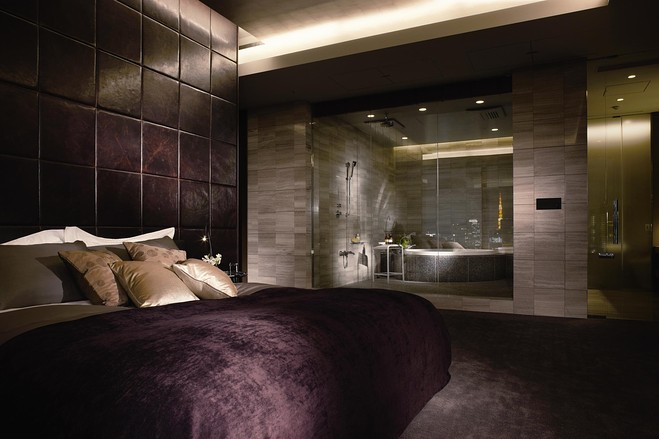 最大待售公寓的主卧面积约50平方米,位于公寓内最隐秘处,就像是公寓中的迷你公寓。背墙旁边隐藏着一间私人厨房,透过隔离主卫与卧室的玻璃墙可看到一个巨型极可意按摩浴缸。