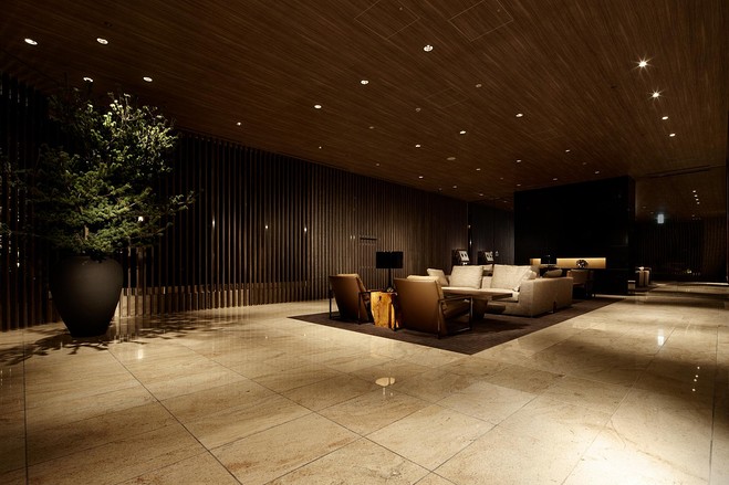 图为平河畔森大厦住宅楼的大堂。住宅楼为14层至23层,本图集介绍的四套豪华公寓位于顶层。