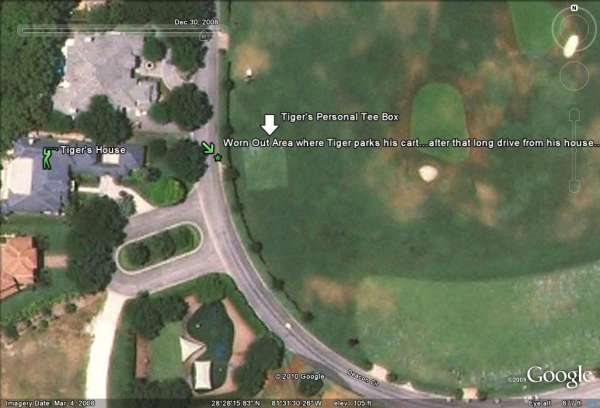 有小人挥杆的地方是老虎伍兹的豪宅,旁边绿色箭头所指的地方是他停放球车的地方,白色箭头所指的地方是他个人的发球台。