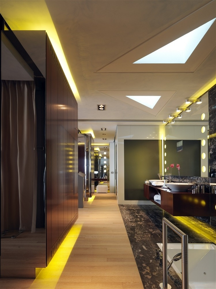 每间浴室都布置了同样的设计原则,但已分别完成不同的。为了保持一定的设计和谐伊罗达,我们选择了简约,自然,豪华的用料。因此,浴室带大理石地板,木制家具项目,反光板和照镜子完成。内置的家具产品,设计了我们的演播室。