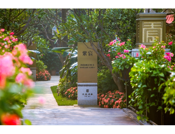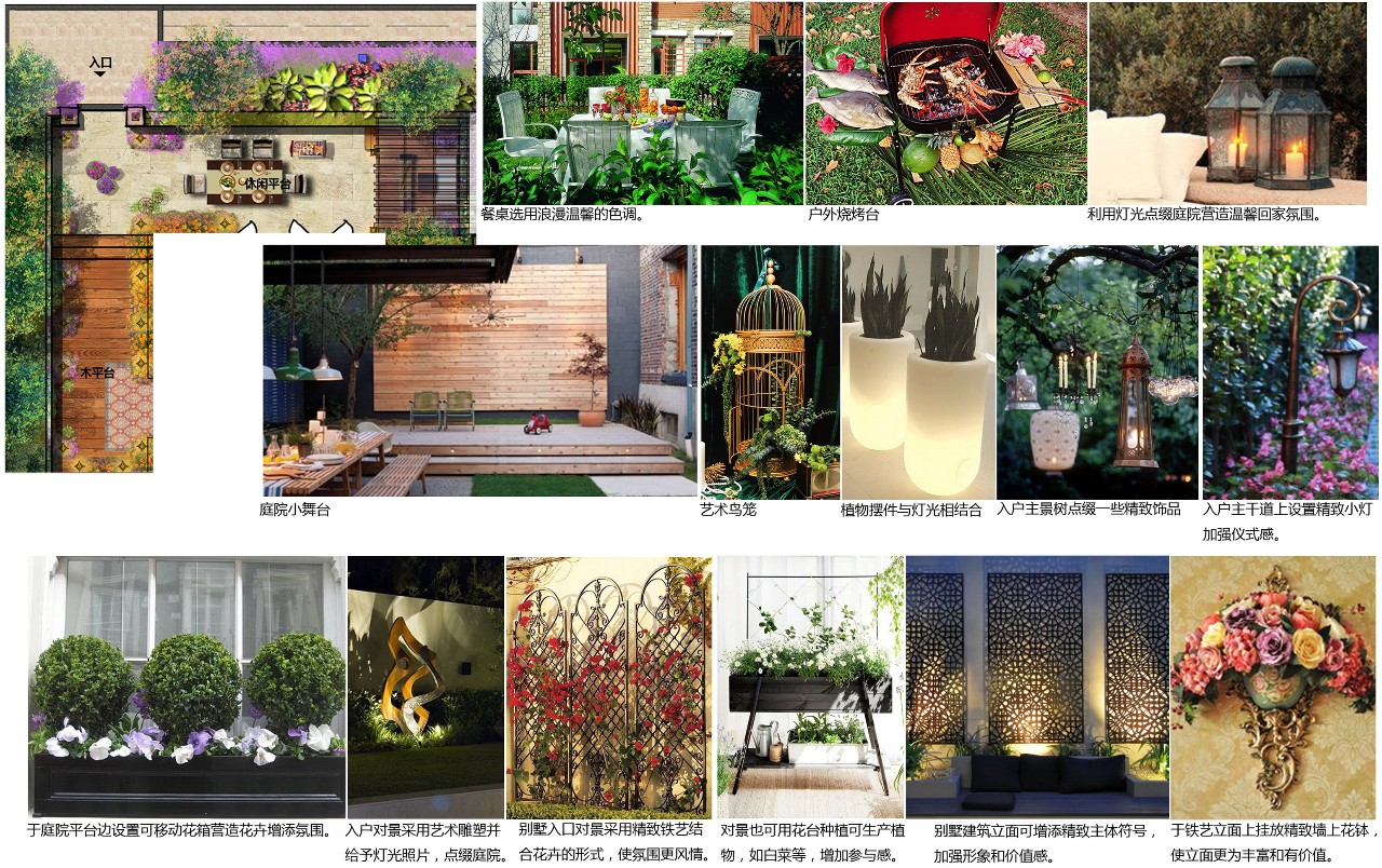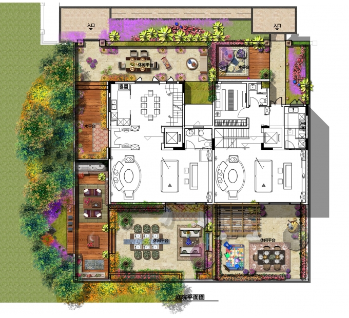 别墅庭院设计主要分为边套北院、边套南院、中套北院、中套南院四个部分。根据南北园空间光线的不同特点,北院光线偏弱,用于提供休憩空间;南院光线充足,主要提供活动空间。