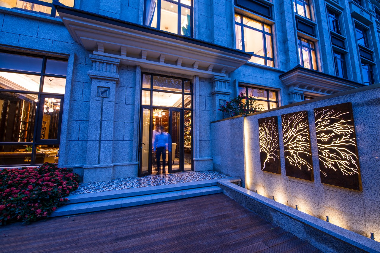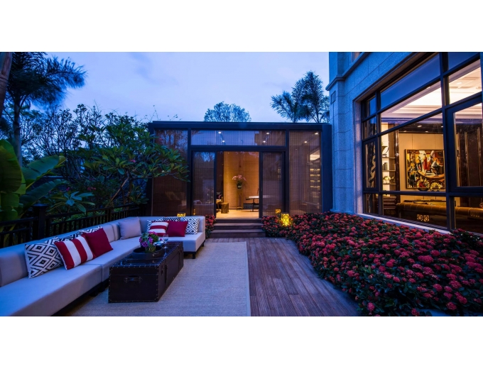 南庭院与室内红酒雪茄空间连接,庭院延续室内空间设置户外品酒空间,随着流水景墙的艺术灯光和音乐,靠在沙发上品酒、聊天、观星,别有格调。