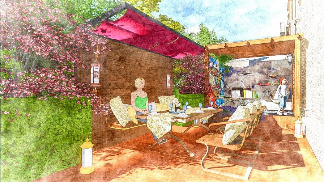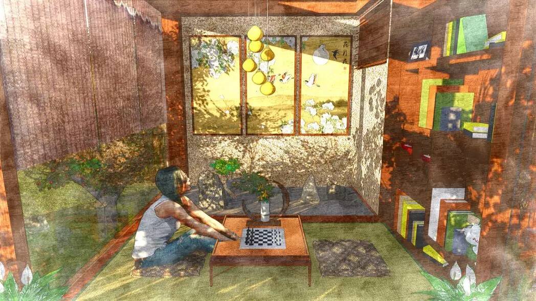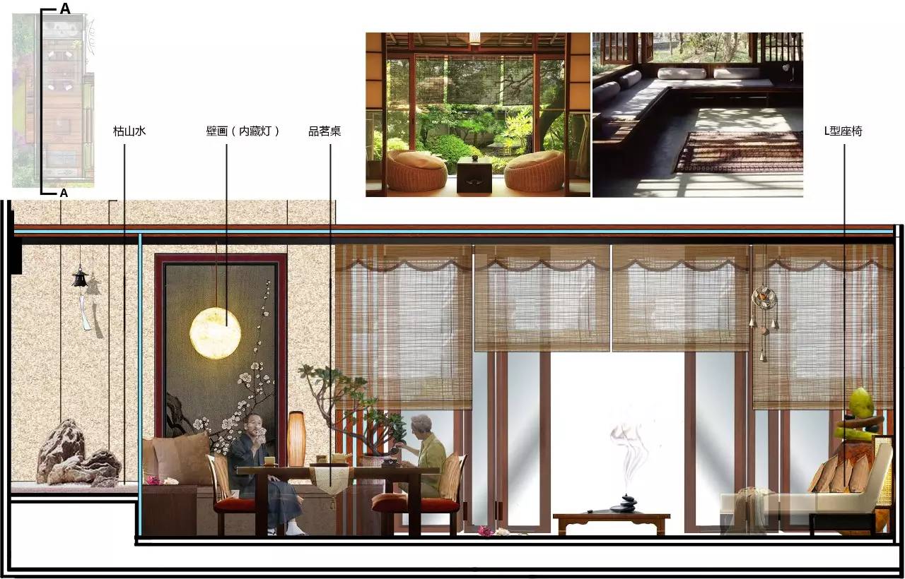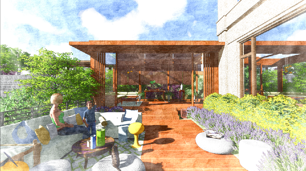北庭院延伸室内餐厅空间,在室外设置露天餐饮空间,木格栅结合坐凳既成为北庭院休闲空间,更为室内餐厅提供了一个对景。东侧设置一木廊架,主要为15岁喜欢航天的孩子提供一个活动工作坊。