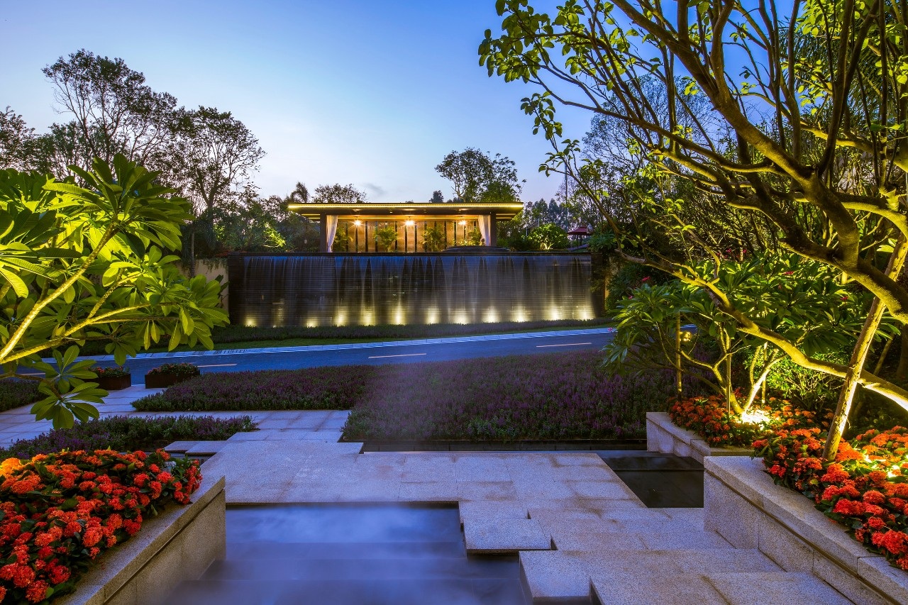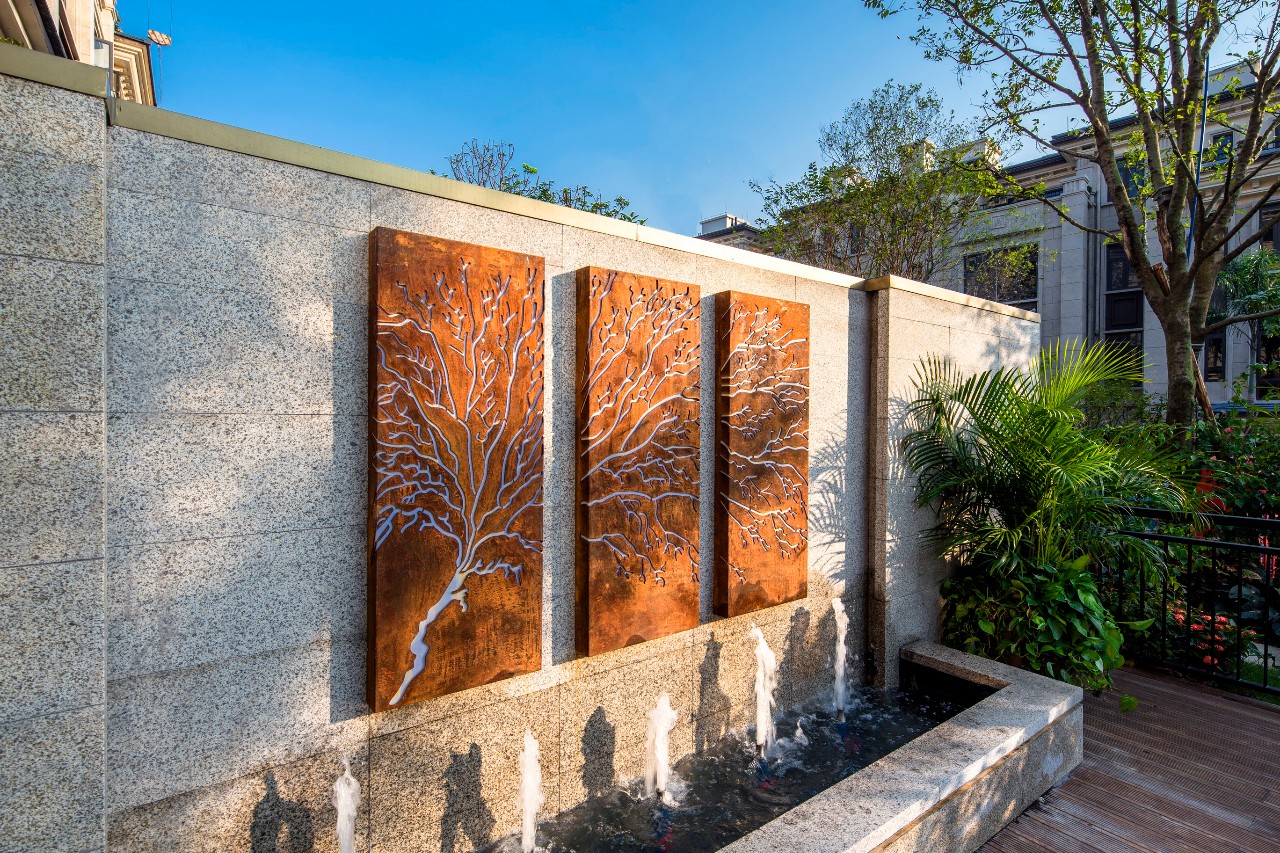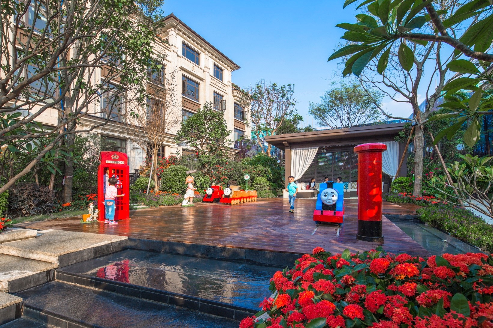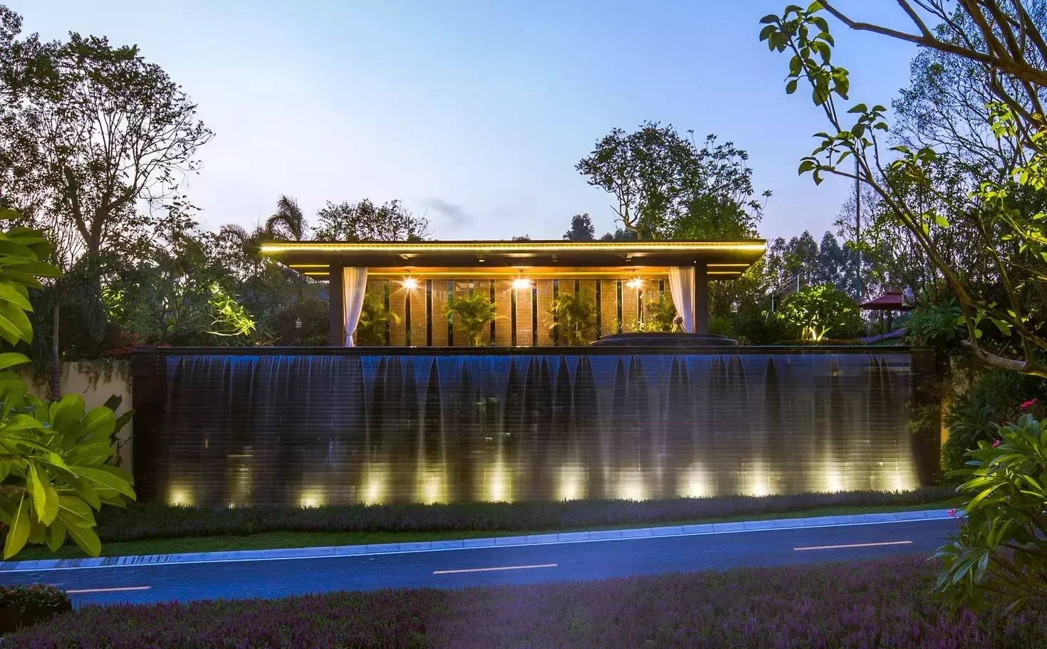 在庭院里往销售区后场的亭台楼阁和叠水望去,犹如高山流水,鸟语花香;潺潺流水延伸至与庭院相连接的三角绿地,整个空间抽象成高山、瀑布、小溪、叠石、林木、芬芳……孩子们在这自然间嬉戏、玩耍,从小陶醉于山水之间。