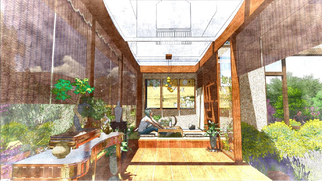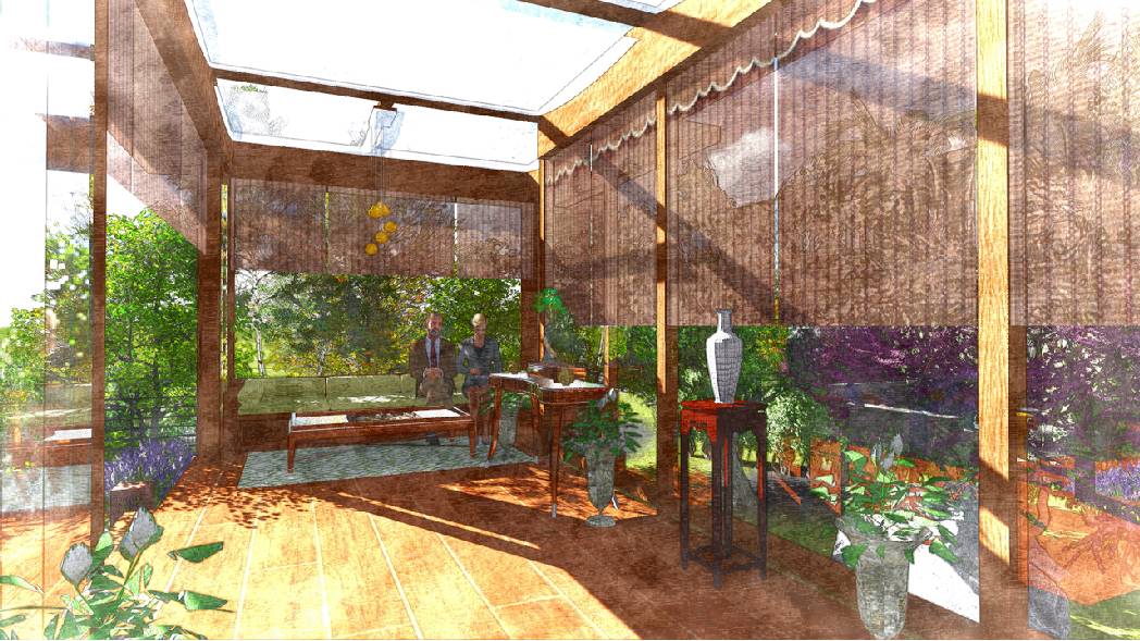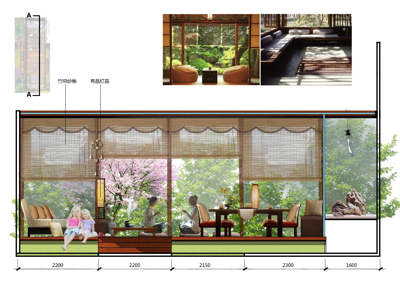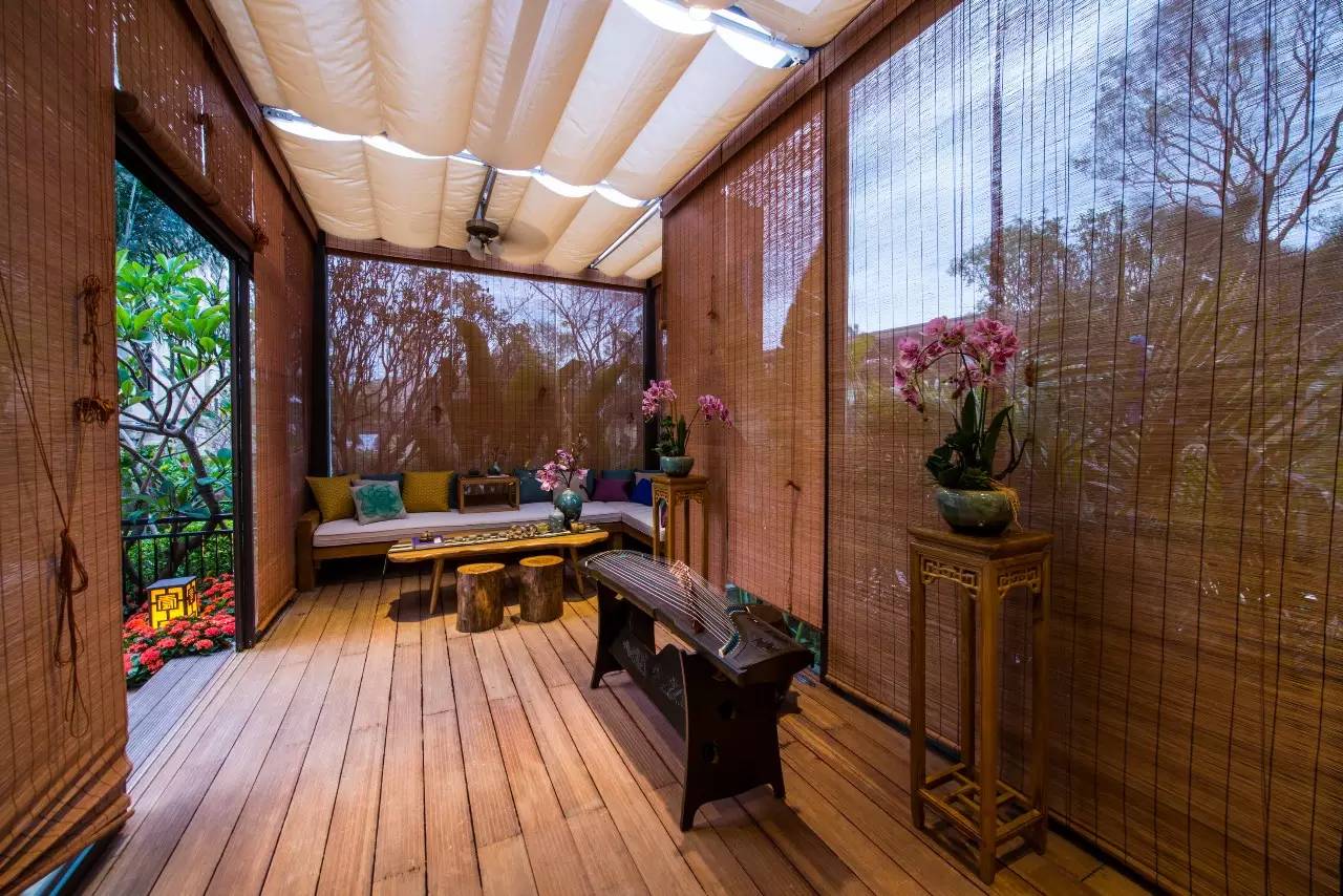 南庭院的一大亮点,富有中式韵味的阳光房。阳光房给予庭院一个新的体验感,一个半室内的通透空间,既能享受室内空间的围合感和凉快感;又能沐浴室外的阳光和植物。阳光与摇晃的叶子透过竹帘子在阳光房的木地板上形成斑斑驳驳的肌理。