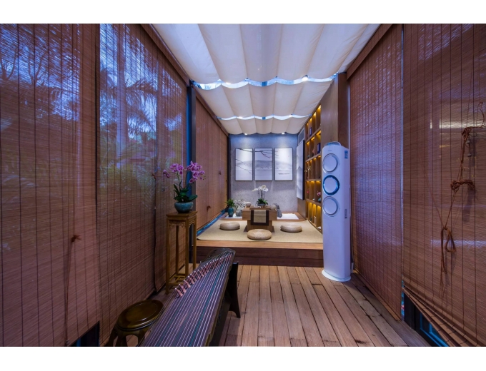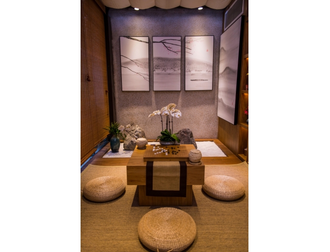 阳光房内分为三个空间,一个对景空间,两个休闲空间。在这里,你可以趴在沙发上,透过玻璃欣赏周边绿树繁花;可以静静地弹奏一曲古典之韵;亦可在静谧素雅的禅意空间细品黑白棋子的智慧。