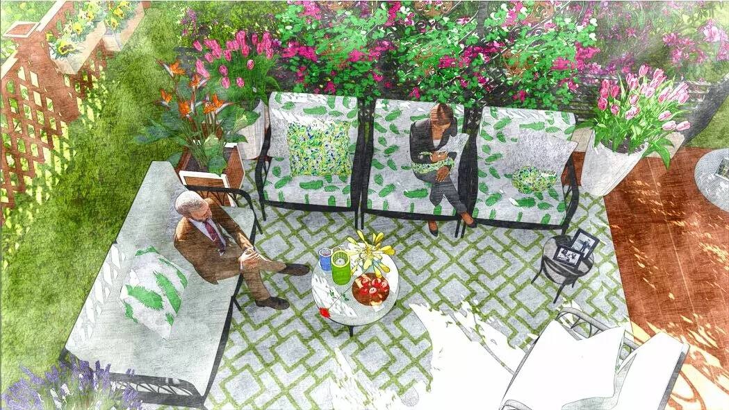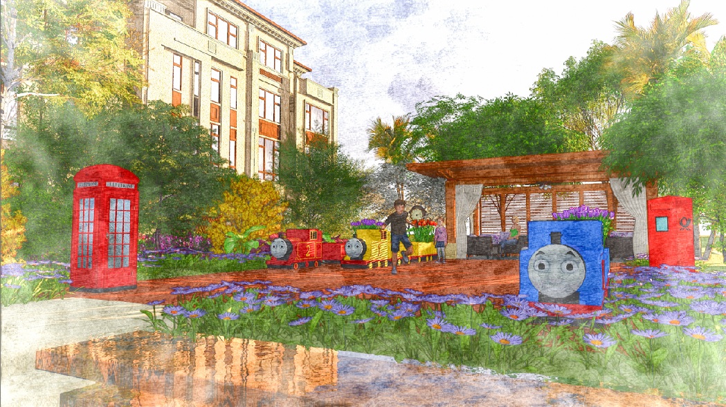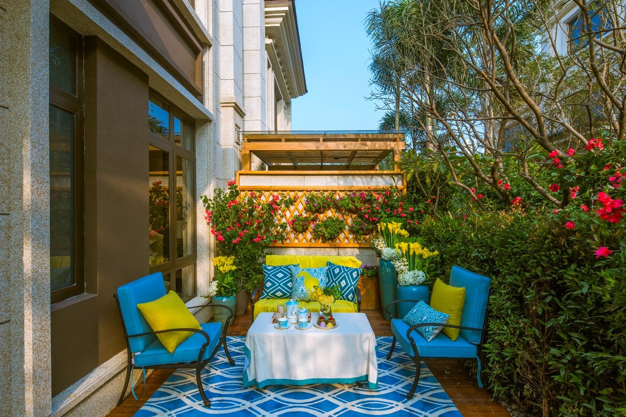 南庭院设置儿童空间以及可看护孩子玩乐的女主人下午茶空间,参考室内女主人工作室的配套用色,将缤纷色彩带到室外空间,绿篱、格栅、花木搭配缤纷的英式下午茶,浪漫而富有情调。