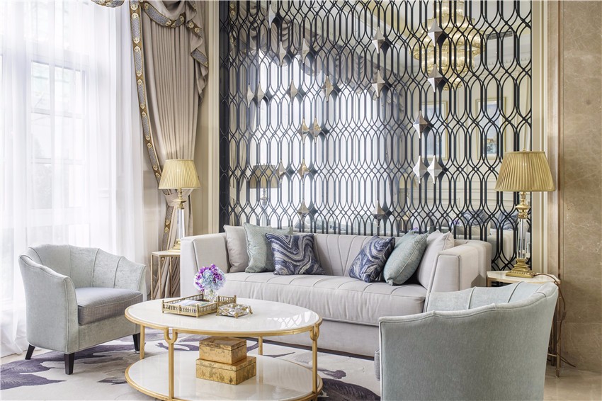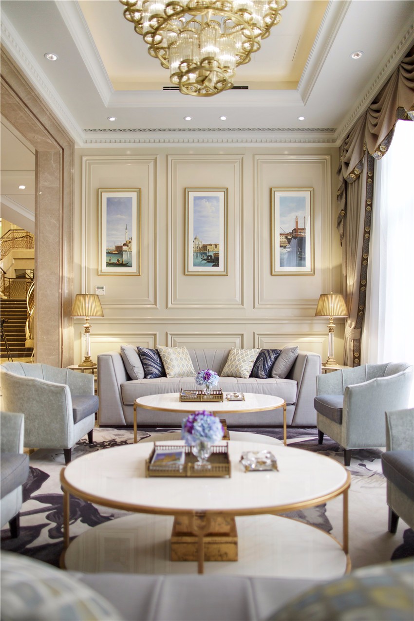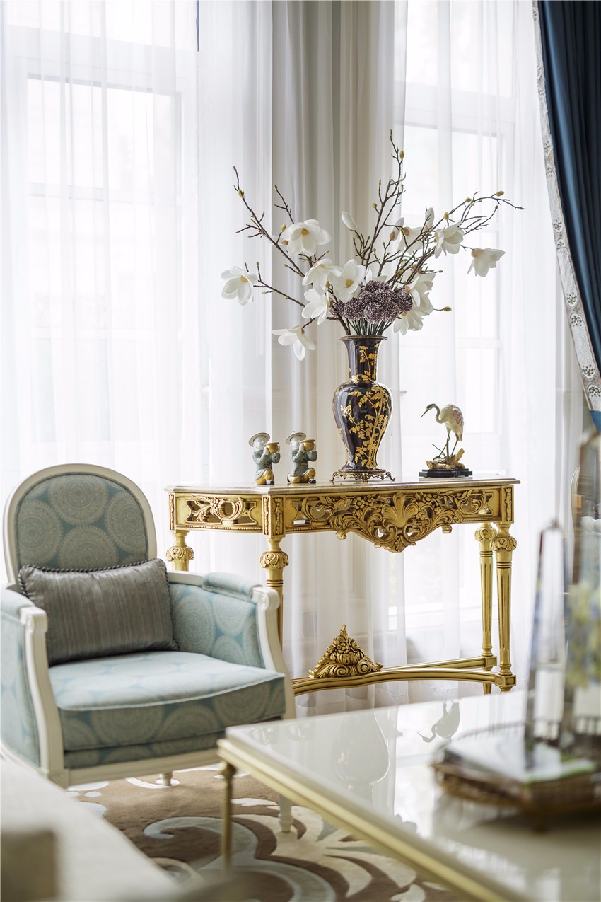 上海绿地海珀畲山售楼处,择址正畲山,系属绿地又一海珀系作品。LSDcasa担纲室内陈设,设计承袭法式新古典建筑艺术和美学神韵,内饰回归法式宫廷中最正统的时代感,且对旧传统重新做了新的尝试与思考,化繁为简,吐故纳新,将法式古典风格的端庄与奢华,与中国当下审美情趣合二为一,实现古典与现代,传统与创新的和谐之美。 整个空间陈设注重气质,留意精神世界。室内一共三层,格局以中轴线对称布局。迎宾大厅作为售楼处的第一空间,由一扇艺术浮雕屏风虚掩而入,完美的天花拱顶、特别订制的水晶吊灯与充满时代感的优雅家俱陈设,凝聚法国古典与当代美艺精华,线条简洁的家具,气质凝练而彰显气度。充满活力的现代法式花艺与艺术饰品随处可见,室内艺术陈设与法国建筑的历史元素相辅相成,与精致内饰相契合,悄然绽放绝妙风华。