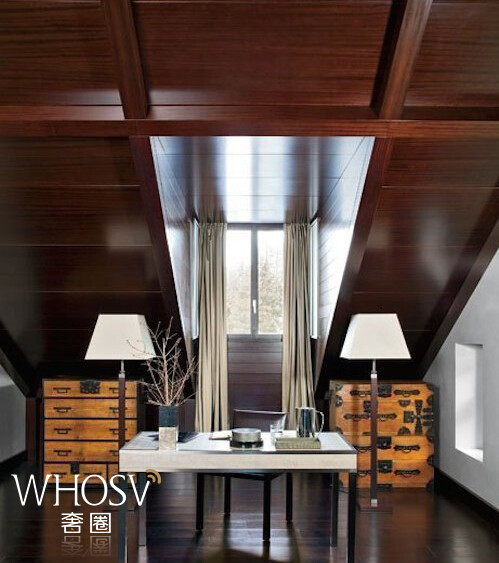 Armani老爷子的房产遍布全球,但每年冬天他都会来瑞士圣莫里茨小镇的这座屋子度假,巨大的落地窗外就是阿尔卑斯山,深色桃花心木的度假屋风格,摩登又舒适,利落的几何线条,随处可见东方情调,有棋牌间还有spa室,家具几乎全是来自自家品牌,让这间大房子基本上成了Armani家居系列的展厅。