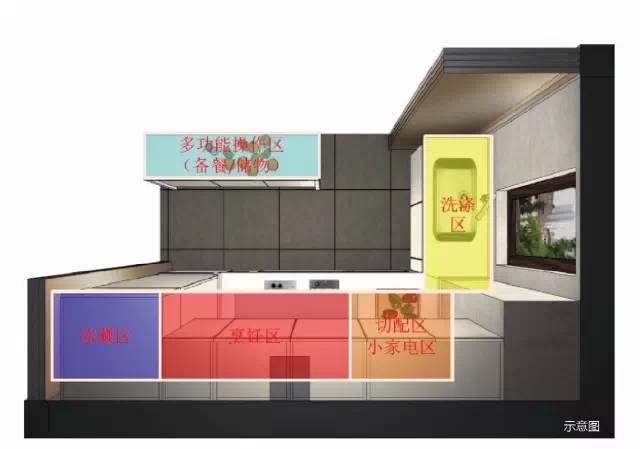 只有真正的美食家才能设计出如此漂亮的分区。冰藏区、烹饪区、小家电区、洗涤区和多功能储物操作区的整合与分离,洗菜、切菜、烹饪流畅动线,三步之内、360度转身即可完成一份漂亮的料理。