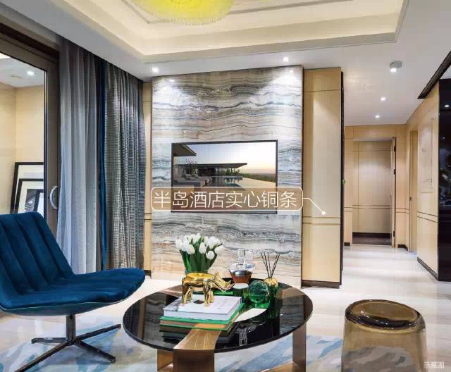 在万科眼中,石头并非是最昂贵的材料,顶多之一。半岛酒店空间设计灵感,翡翠滨江在天花嵌条,硬包嵌条,腰线,踢脚线等硬装上,均采用了制作精良、工艺考究的铜艺。墙体腰线基于黄金分割原则,万科不吝成本选用实心铜条(而非一般选用的铝镀铜)。以105㎡户型为例,铜艺装饰线条总长127.6米,相当于一个足球场的长度。