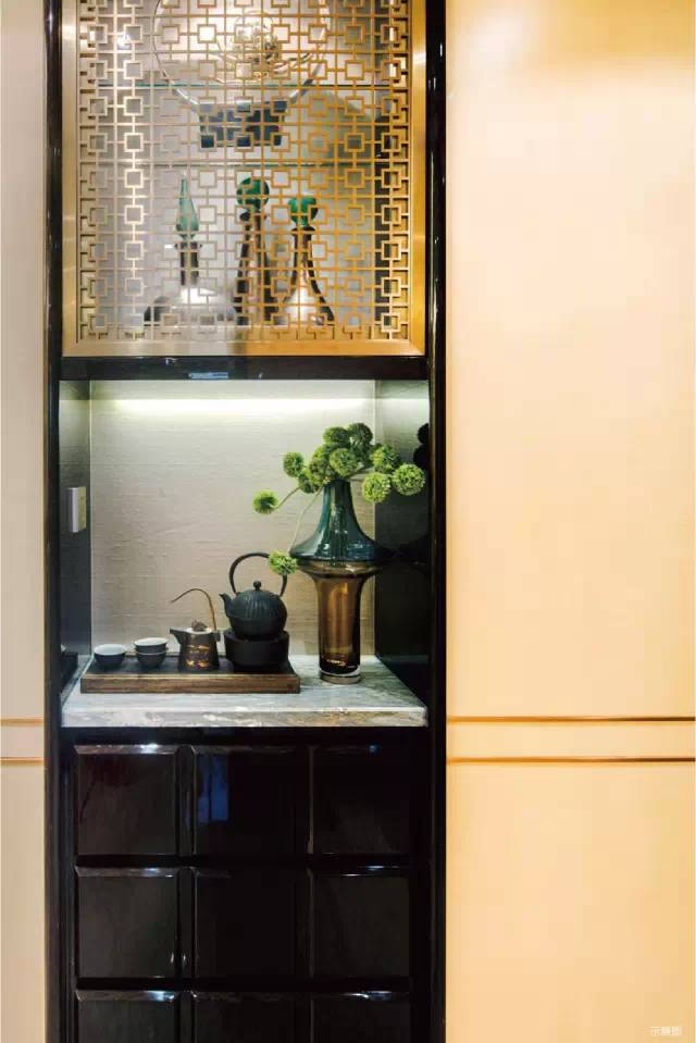 全国仅北京华尔道夫酒店与万科翡翠滨江使用该款收藏品柜。东情西韵装饰风格,当内置灯光开启,照耀在藏品与摆件之上,微弱的暖黄色灯光与藏品和摆件融于一体,诠释出主人不俗品味。