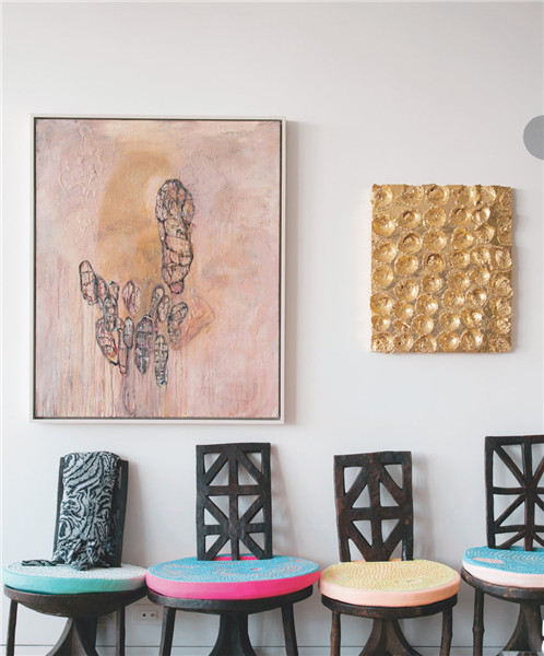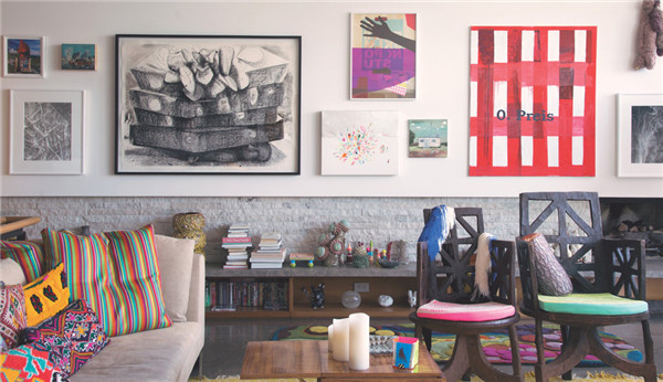 辛迪·舍曼的家。舍曼是这样布置她的卧室的,最左侧是她工作室管理人玛格丽特·李画的房子,接下来是亚历山大·罗斯、波莱纳·奥罗斯卡、查尔斯·朗和韦恩·怀特的作品。底层从左至右,分别是艺术家布鲁斯·利伯曼、玛莎·里奇,M.亨利·琼斯和约翰·劳瑞的作品。而插有鲜花的的雕塑花瓶则由马修·所罗门创作。