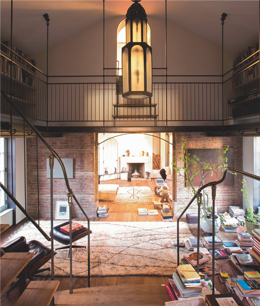 美国艺术家布赖斯·马登和海伦的家。这里是马登的两层高的图书馆,海伦·马登每年都会数次前往摩洛哥,带回来房间里的这些柏柏尔地毯。两幅布赖斯·马登的早期作品挂在图书馆两侧的墙面上。左侧:"无题"(1966年),右侧:"亚利桑那"号(1963年)。