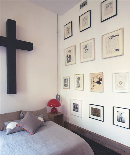 ="word-wrap: break-word; overflow: hidden; margin: 0px; padding: 0px;"> 瑞士艺术家乌戈·罗迪纳的家。悬挂在床头的是艺术家瓦伦丁·卡伦(Valentin Carron)创作于2006年的十字架,相邻的墙上则是包括约翰·柯琳、凯伦·基里姆尼克和安迪·沃霍尔等创作的蒙太奇人体。"你看,这里既有阳刚也有阴柔,"罗迪纳说这是他的特意安排。