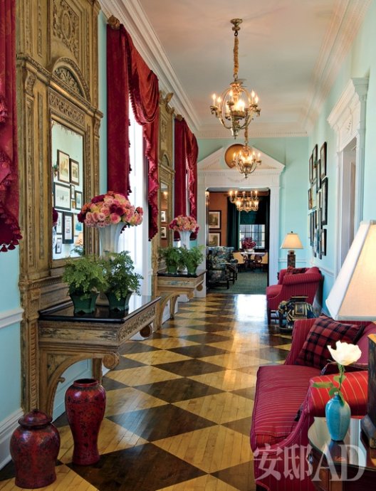 *设计师是运用色彩的高手,改造后的会客厅用色大胆,温暖而不杂乱,所有的软装饰都和这里古老的氛围相呼应。地毯来自Stark,摆放于壁炉两侧的座灯来自Vaughan,扶手椅的面料来自 Cowtan & Tout,条纹软垫椅的面料来自Decorators Walk,百褶窗幔来自Brunschwig & Fils,窗边坐椅的面料来自Kravet。