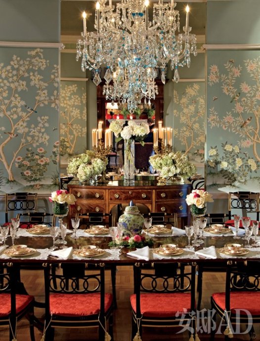 *你会觉得这个餐厅很乱吗?NO,不管从色彩搭配,还是家居饰品的摆放位置来说,设计师都是经过了精确的设计的。餐厅以花为主题,在一个花花世界里用餐,我想这是最美妙的享受了。餐椅的红色坐垫瞬间点亮了这个餐厅,也让整个空间有了层次感。