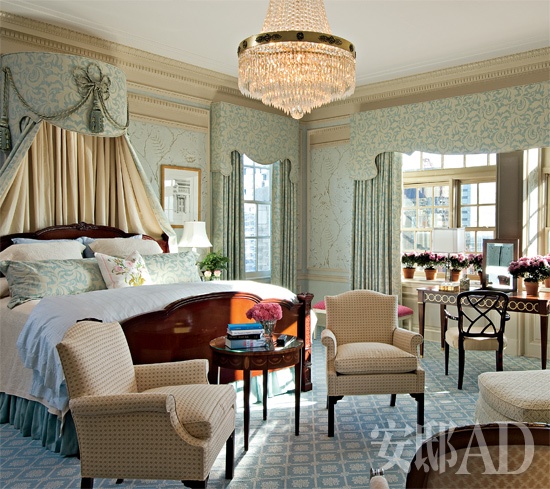 *该房间的用色非常恬静,一张超宽的美式大床取代了原来的两只单人床。床边又多增加了一个谈话区,当然椅子的位置可以随时调节。1号家居馆的馆主非常喜欢那个浅蓝色的壁纸,素雅恬静,床头顶部的设计非常棒,在这里你就是公主了。每一种颜色都有着神奇的作用,如蓝色就有安神的作用,可以洗涤人的心灵,喜欢或者经常使用蓝色的人一定是心态纯净、热爱和懂得享受生活的人。难怪奥黛丽赫本这么留恋这里,在这个蓝色为主题的卧室,仿佛置身纯净的大海,多么心宽神怡啊。