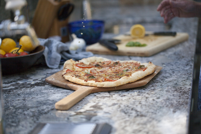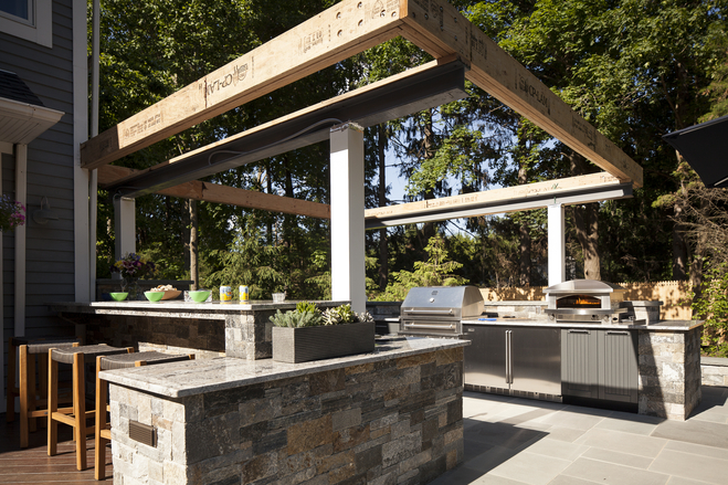 这个室外空间配有辐射热灯取暖装置,让一家人在寒冷的月份也能使用该空间。(雷斯勒夫妇目前在建屋顶,这样雨天也能在室外做菜。)