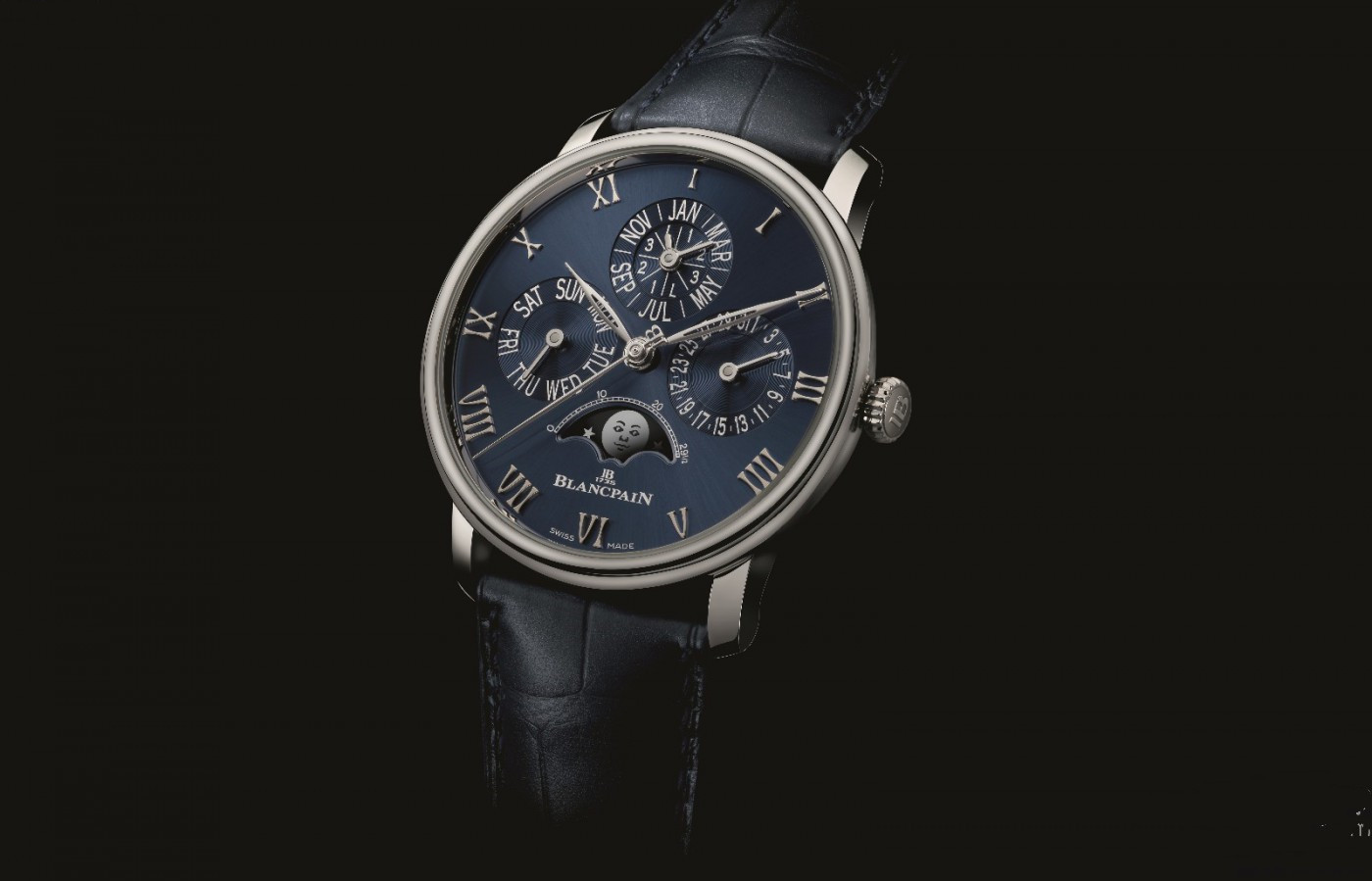 在万年历表里有一个微型的卫星齿轮每四年自转一周。如此,便可以自动准确地显示日、月、星期及月相盈亏不会因闰年而有所误差。1582年教宗格列高里十三世将儒略历稍加修订成为现代通用的日历,即一年365天。每四年一闰,加一天,每百年当闰不闰,每四百年则要闰。所以blancpain万年历表一直要到公元2100年才会误差一天,每支blancpain万年历表都以手工精确地组装完成并刻上编号及制表师傅的姓名。所谓fly back指的就是飞返式计时码表一般来说,计时码表为了保护机械结构。在计时中归零键不能作用一定要停止计时后才能够归零而后继续下一次的计时。但在fly back的结构内则允许随时按下归零键,所有的计时记录器也同步回归稚龄。放开按键后并立即再行计时。因此,一只具有fly back功能机芯的腕表。在技术上的考验自然不言而喻,研发fly back功能的动机主要是因为在没有电子导航系统年代中,战斗机的操作需要多次计时,在电子导航装备陆续研发之后,fly back此项功能渐渐在各表厂的表款中停产,直到近年机械表盛行风气抬头,才有表厂在表款中专门配有此项功能以飨特殊功能爱好者,而blancpain更是其中的佼佼者。事实上,制造一支三问表需要超过10,000工时,即使在现代,仍是属于限量生产的高价表。