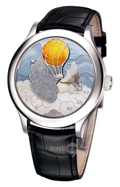 梵克雅宝 Cinq Semaines en Ballon逆跳手表,左边鸽子为时针,右边的锚为分针。