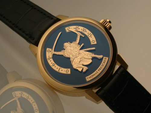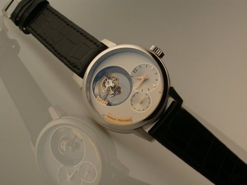 Thomas Prescher在2003年首度在AHCI(Academie Horlogere des Createurs Independants)展出他的雙軸陀飛輪懷錶,技驚四座。最早發明雙軸陀飛輪的是Anthony Randall,他在1978年註冊專利。. 20年後,Richard Good註冊了三軸陀飛輪專利。包括Randall、Good, 和Richard Habring都製作過雙軸陀飛輪,但都是座鐘(carriage clocks),第一個發表雙軸陀飛輪手錶的是Franck Muller,而Thomas Prescher則是第一個發表雙軸恒動飛行陀飛輪手錶(double axes flying tourbillon with a constant force device)的製錶師。