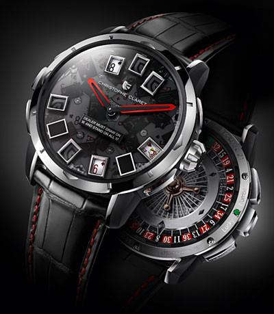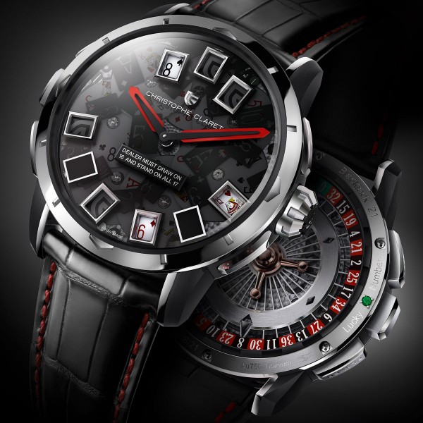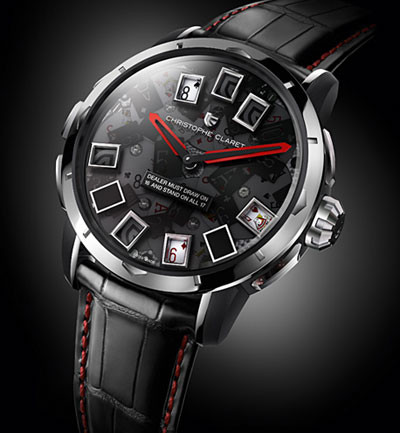 手表制作大师Christophe Claret推出了他最新的奢华腕表设计作品:21黑杰克手表(二十一点),21黑杰克不单单是一只手表,还是一个可为富人所享用的高级奢侈品玩具,集合了赌场中常见的三种游戏项目:二十一点,轮盘及骰子游戏。表盘上,红色指针指示时间,一切都看似平凡无奇,但它那些外加的功能使得这个手表能够轻易的脱颖而出。
