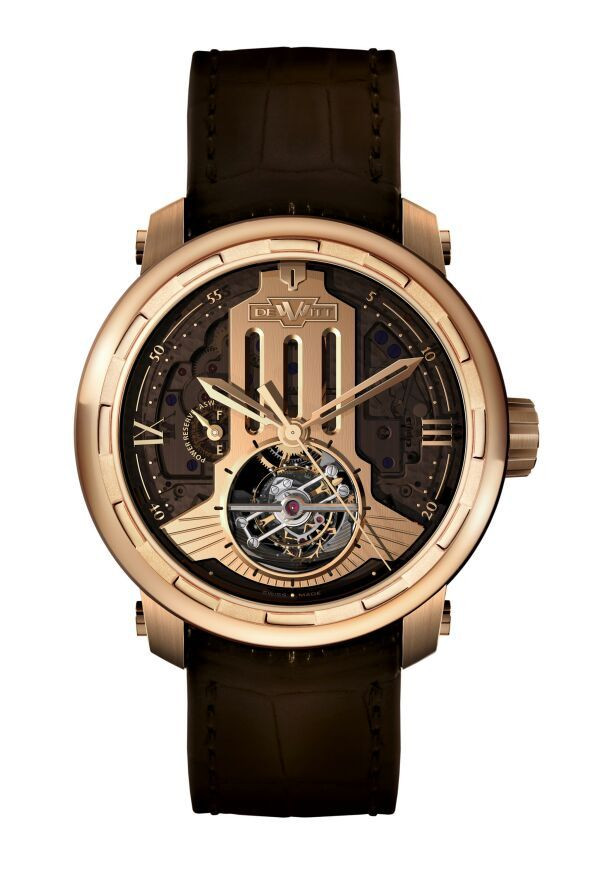 Twenty-8-Eight跳秒陀飞轮腕表,18K玫瑰金圆形表壳,表环有DeWitt首本的皇家圆柱坑纹装饰,直径46 毫米,时、分、跳秒、动力储备显示,DeWitt表厂自行研制DW 8014自动上链机芯,动力储备72 小时,染色水晶玻璃面盘,半哑光深棕色鳄鱼皮表带,防水30米,限量250只。