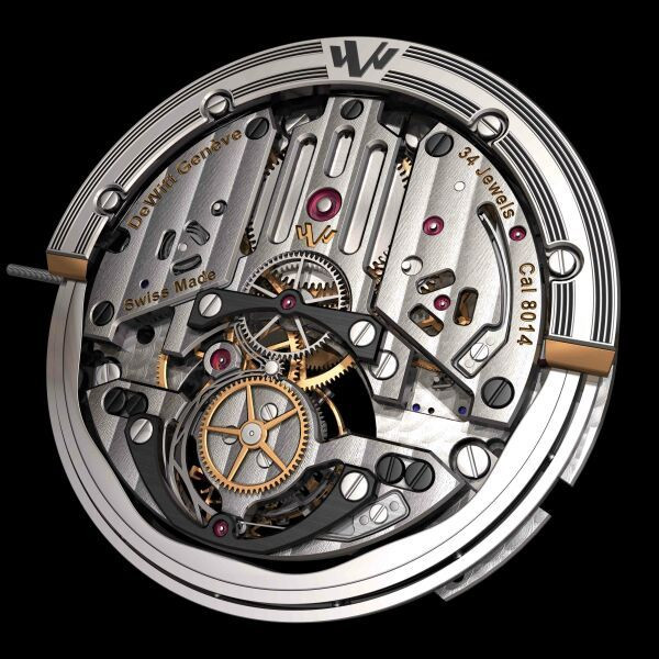 DeWitt表厂自行研制DW 8014自动上链机芯,由外缘环形摆陀驱动,拥有专利ASW自动调节上链效率技术,跳秒针与陀飞轮框架直接相连,表盘有动力储备显示,摆频每小时18,000 次(2.5 Hz),Glucydur可调节惯性摆轮,菲利普斯曲线Straumann Hairspring游丝。