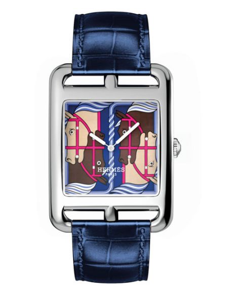 仿照爱马仕“Galloping H” 丝巾珐琅彩绘表盘,黑色短吻鳄鱼皮表带。