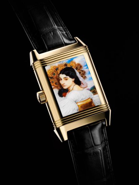 以著名画作《Pavonia》为原型制造的微绘珐琅手表,Reverso系列,可翻转表壳设计,18K金表壳,黑色鳄鱼皮表带。