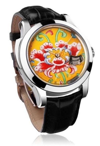 830P机械机芯,白金镶圆钻表壳,彩绘玻璃珐琅工艺表盘,鳄鱼皮表带,白金镶钻石表扣,限量8枚。