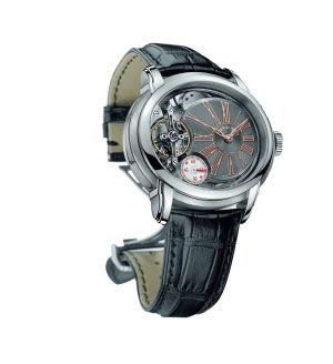 2009年时第一代Zeiwerk跳字表的问世,让人突然发现,朗格其实是可以传统也可以前卫的。于是,2011年,朗格将第一只“带响的 表”的殊荣给了Zeitwerk,在两个数字显示盘下多了两枚音锤,透过数字转盘转动时的动能,为音锤的敲击储备能量。左音锤每小时敲响一次声音较低、右 音锤每15分钟敲响一次声音较高。在不允许发出声响的环境,只要按下4点位置的按钮即可关闭报时功能。它报时、报刻,又不是传统的问表,加上独一无二的跳 字显示,是今年的怪杰时计之一。