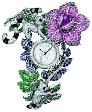 这只梵克雅宝Décor Makis腕表是今年SIHH上最夺人眼球的女王,创作灵感来自法国小说家凡尔纳笔下的非洲丛林。简单的线条勾勒出枝叶的丰盈和花瓣细腻的美态,两只拥有 黑玛瑙尾巴的钻石猴子在林间穿梭,花朵的造型可以开合,露出珍珠贝母的表盘。绿得青翠、蓝得深邃、粉得娇艳,只有拥有极致品质和灵魂之美的宝石才能呈现出 如此让人心动的和谐色调。