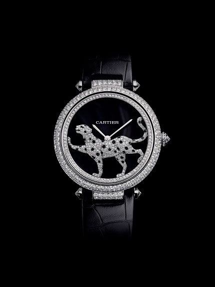 这是一枚巧夺天工而又奇思妙想的腕表,卡地亚将自动摆陀的功能性与猎豹的装饰性完美结合:栩栩如生的立体猎豹悄然与机芯相连,使这只大猫看似在墨色的珍珠母贝表盘上徘徊潜行,随时间而漫步。