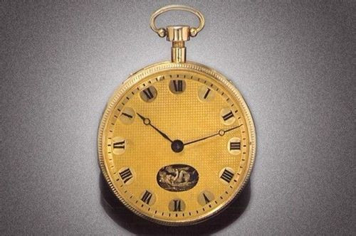 18K玫瑰金三问春宫表,该款春宫表制成于1825左右,受帝国风格影响,设计简约,阿拉伯刻度和蓝钢指针。滑开表盘下部的一块挡板便可看到春宫活动人偶。1990年12月,在佳士得Christie`s香港拍卖会上拍出1,436,250港币的高价